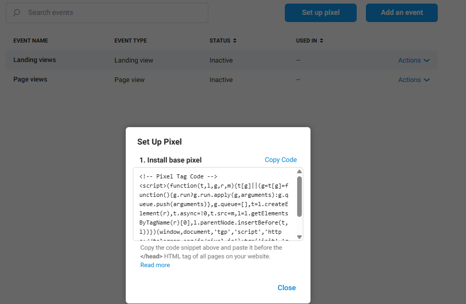 Дополнительно доступно подключение Telegram-пикселя, который связывает сайт с рекламным кабинетом.