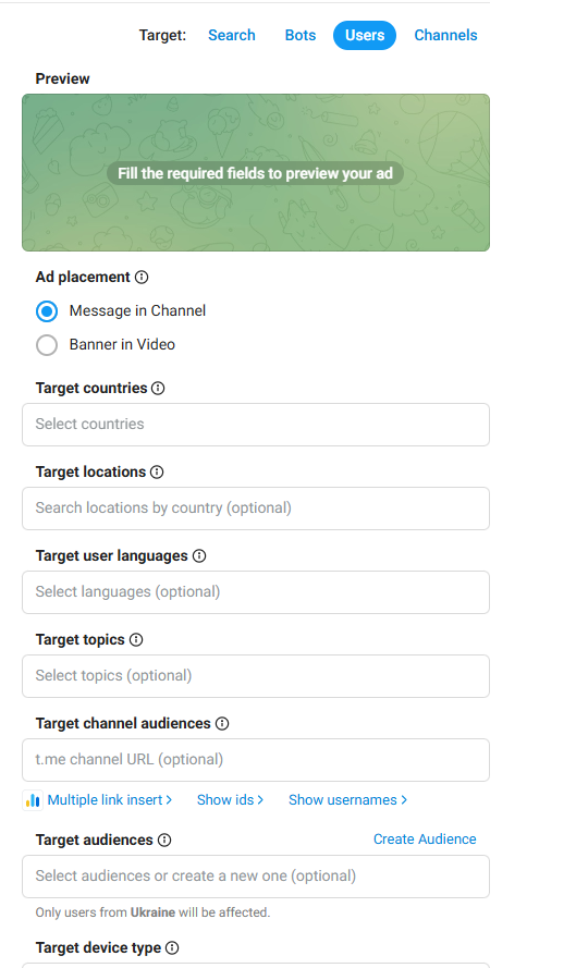 - запуск рекламных кампаний по всем доступным каналам Telegram;