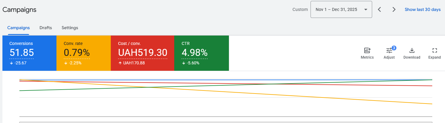 - Не використовувався повний потенціал інструментів зокрема можливості оптимізації під цінність конверсій та робота з аудиторіями.