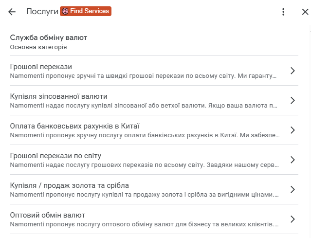 Для кожного профілю було сформовано структурований перелік послуг, який відображає реальні запити клієнтів: обмін основних валют, криптовалютні операції, грошові перекази.