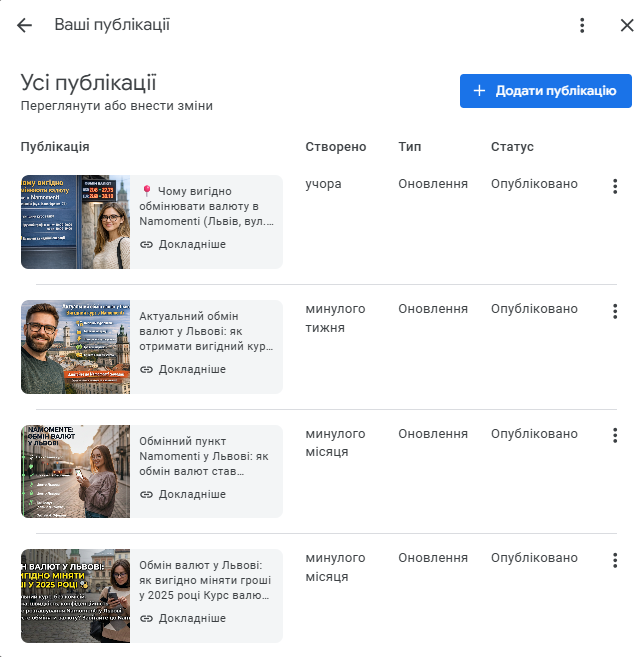 • Налаштували системну публікацію постів (≈2 рази на тиждень, з прив’язкою до міста та адреси).