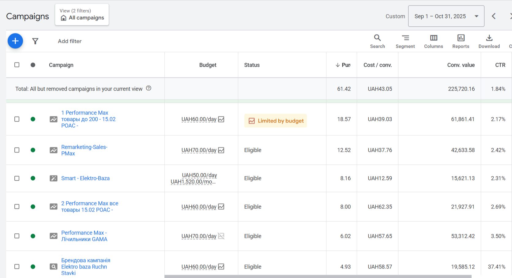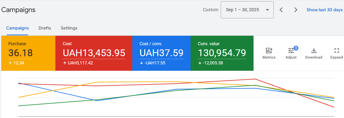 - Товарні кампанії та Performance Max працювали без чіткої сегментації по категоріях, що не дозволяло контролювати рентабельність окремих груп товарів.