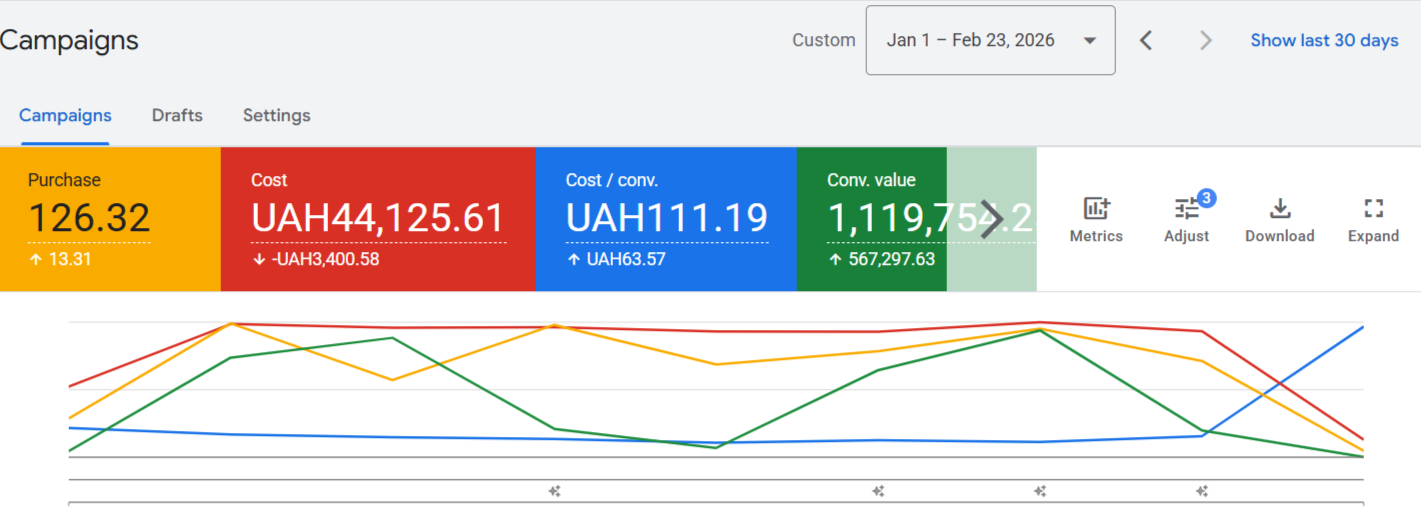 Ми провели аудит, переробили структуру Google Ads, оптимізували товарні кампанії та аналітику.