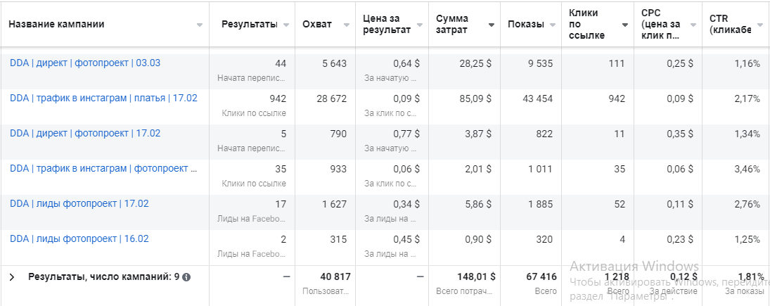 Витрачено на мету повідомлення в direct та лідогенерацію: $58,91