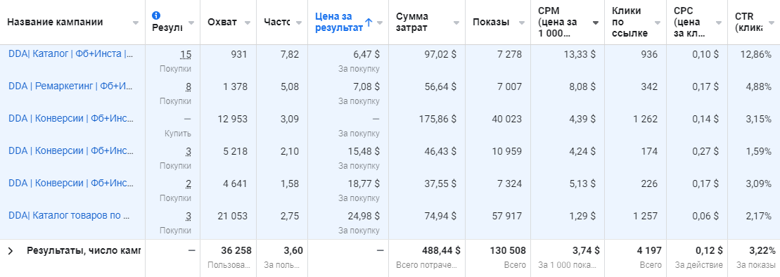 - вартість однієї покупки за метою "Конверсія" - $ 14,82, за метою "Продаж за каталогом" - $ 16,84.