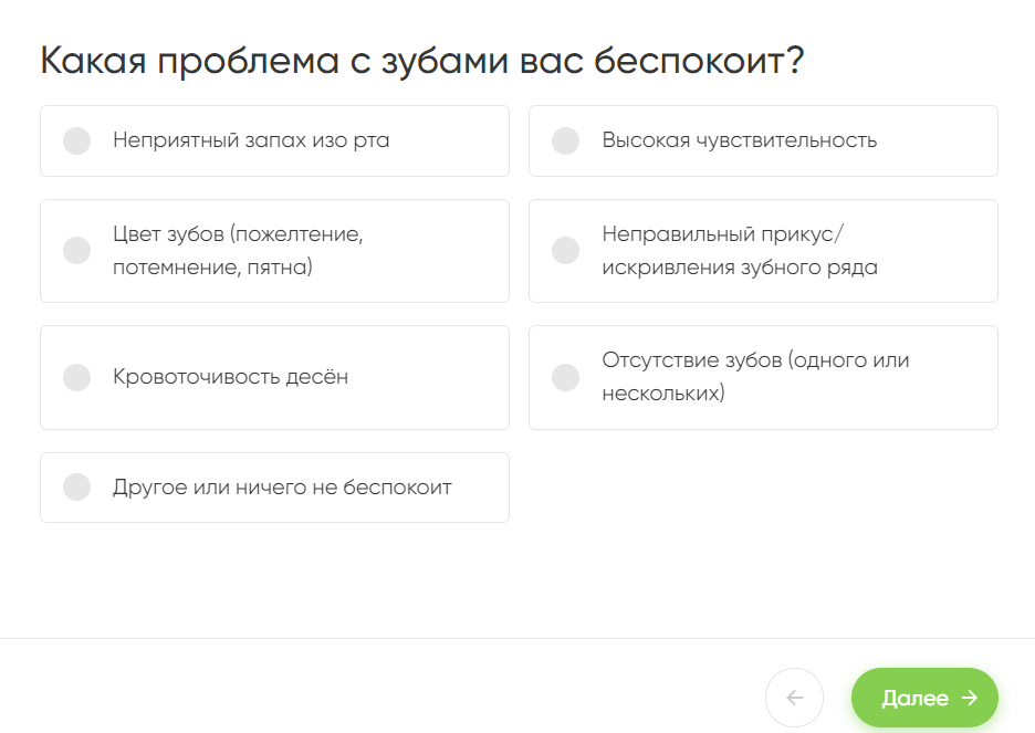 До нас звернулася стоматологічна клініка. Завдання стояло наступне - генерація заявок на послуги зі стоматології. До співпраці з нами вони мали досвід генерування заявок за допомогою лід-форми всередині Facebook, але заявки були неякісними. Для покращення якості заявок та, як наслідок, підвищення ефективності каналу Facebook, ми розробили квіз-форму. У ній користувач міг вибрати проблему, що його цікавить, а надалі отримував варіанти відповідей, які можуть пов'язані з цією проблемою. Це була свого роду "воронка" з нішуванням під конкретну проблему. Оффер Для того, щоб реклама була дійсно ефективною, ми вигадали оффер. Його ми й використовували у квізі, а саме тригер: "Отримати персональну консультацію зі знижкою". Під час тестування форма неодноразово змінювалася і найефективнішим варіантом став 1-й екран із зазначеними вище заголовками. Для того, щоб стоматологи могли предметніше спілкуватися з потенційними пацієнтами, були додані варіанти відповідей з нішуванням під кожну проблему: Після такої подачі якість заявок значно збільшилася і побільшало продажів. На даний момент ми “докручуємо” оффери у банерах, щоб збільшити клікабельність та покращити загальну ефективність. Підсумки співробітництва: Агентство Дніпра DASH виконало поставлене завдання та клієнт був задоволений співпрацею. В результаті ми витратили: